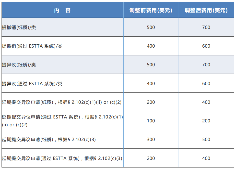 - TTAB opposition,appeal and trial proceedings(商標(biāo)審理與上訴委員會(huì)的異議、上訴和審判程序)現(xiàn)今美國專利商標(biāo)局正式公布漲價(jià),這也是美國商標(biāo)局近三年來第一次上調(diào)收費(fèi)標(biāo)準(zhǔn)