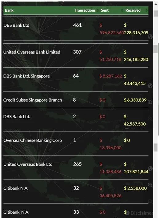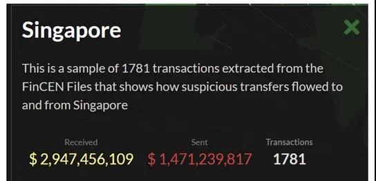 這批文件也顯示,其間共有1781宗“可疑交易”流經(jīng)新加坡,流入新加坡的資金總額為29億4746萬(wàn)美元,從新加坡流出的資金有14億7124萬(wàn)美元。