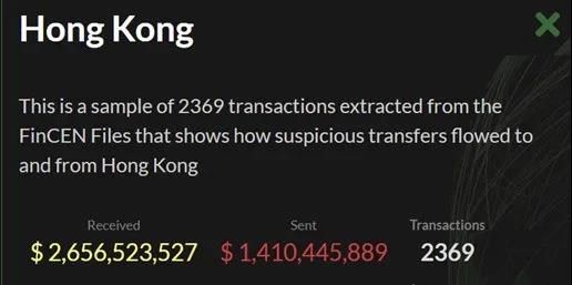 同時(shí),文件顯示有2369宗“可疑交易”與香港特區(qū)有關(guān),有超過(guò)26億美元流入香港,14億美元從香港流出。