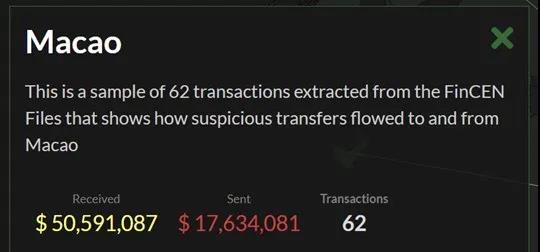 文件顯示有62宗“可疑交易”與澳門(mén)特區(qū)有關(guān),有超過(guò)5000萬(wàn)美元流入香港,1763萬(wàn)美元從澳門(mén)流出。