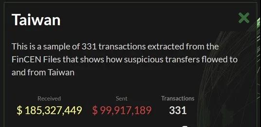 文件顯示有331宗“可疑交易”與臺(tái)灣地區(qū)有關(guān),有超過(guò)1.85億美元流入臺(tái)灣,近1億美元從臺(tái)灣流出。