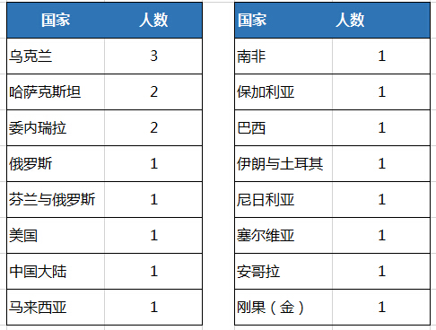 這20人絕大多數(shù)出現(xiàn)在發(fā)展中國(guó)家,烏克蘭名列榜首,有3人;其次是哈薩克斯坦、委內(nèi)瑞拉、俄羅斯,各有2人。