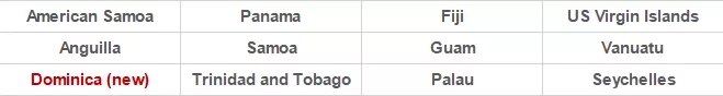 美屬維爾京群島、美屬薩摩亞、安圭拉、多米尼克(新增)、斐濟(jì)、關(guān)島、帕勞、巴拿馬、薩摩亞、塞舌爾、瓦努阿圖、特立尼達(dá)和多巴哥。
