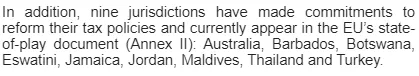 此外,9個(gè)司法管轄區(qū)已作出改革其稅收政策的承諾,已從非合作名單除名,但仍處于考察階段,包括澳大利亞、巴巴多斯、博茨瓦納、斯瓦蒂尼、牙買加、約旦、馬爾代夫、泰國和土耳其。